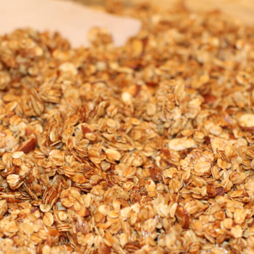- Stir the granola when it comes out of the oven to break it up before cooling. Alernatively you can leave it and break it into larger peices once it is cool.