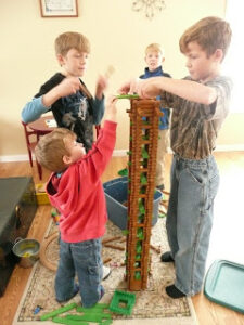 The tower stood strong despite the resident 3 year old stressing everyone out and almost sending it tumbling a million times. My boys are awesome designers! I love having them at home to watch things like this happen.