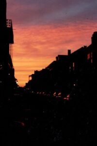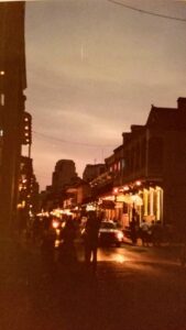 Later, I ended up walking through Bourbon Street after the festival finished and found Jazz screaming out of every doorway. Ate some amazing Cajun food under the most fabulous sunset sky. I hope the photo turns out.”