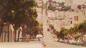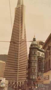 “I walked all over town today from Fishermans Wharf, North Beach, Coit Tower, Transamerica Pyramid and China Town. Oh, the smell of fish and garlic around the city, and the pungent smells in Chinatown were wonderful! There was a movie being filmed right on the street and we had to wait for them to finish shooting!